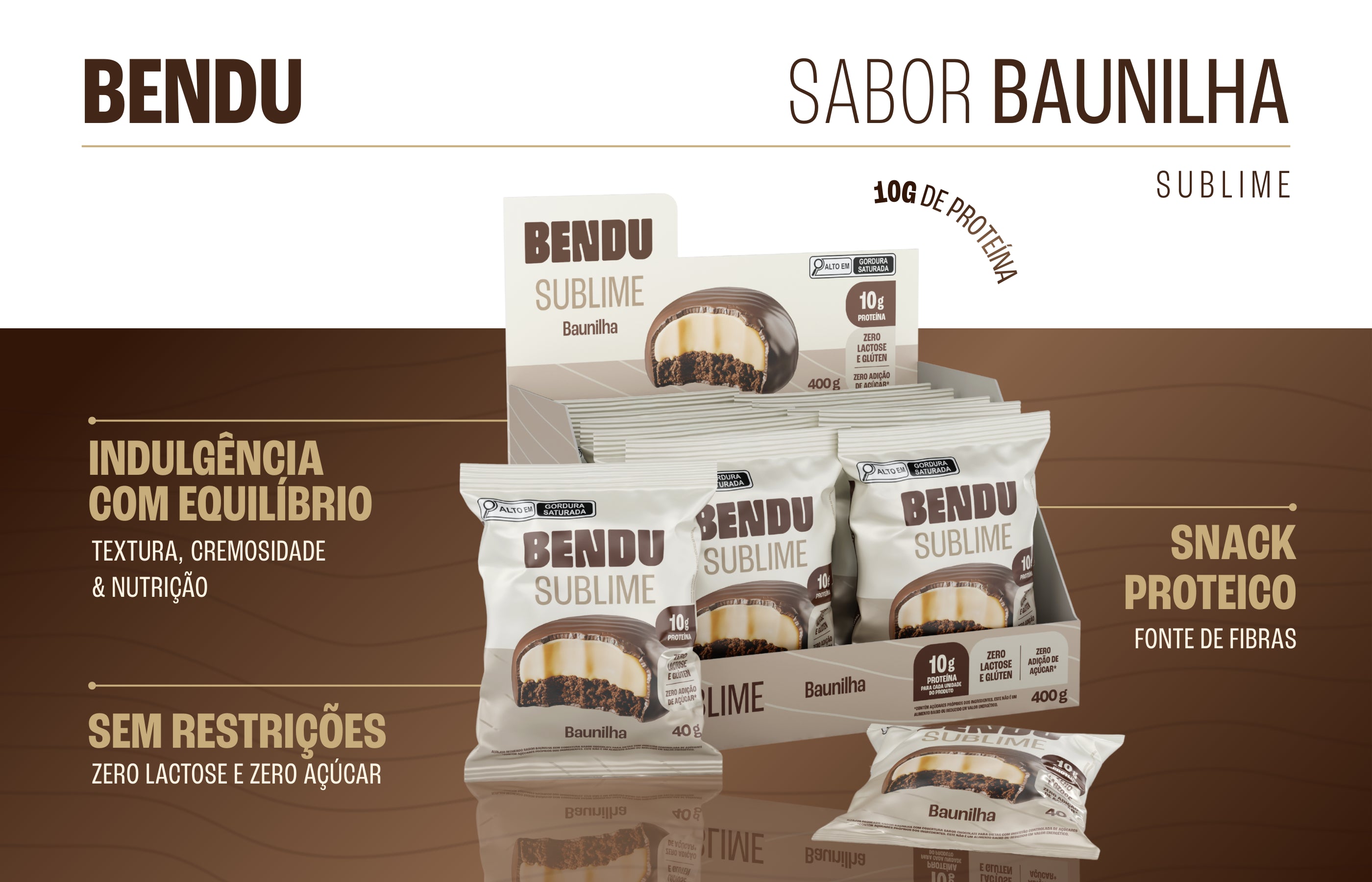 Display com 10 unidades do Sublime Baunilha – cada um com 10g de proteína, zero lactose, zero glúten e zero adição de açúcares.